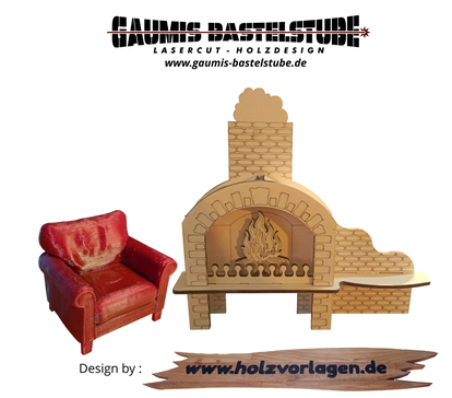 Dieses detailreiche Set besteht aus einem urigen Sessel (3D-Druck, PLA) und einem offenen Kamin aus 4 mm Pappelsperrholz – perfekt als gemütliche Ausstattung für deinen Wichtel.