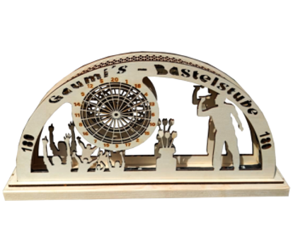 Erleben Sie den faszinierenden Charme des Dartspiels mit unserem einzigartigen Dart Schwibbogen aus hochwertigem 4 mm Sperrholz. Dieser kunstvoll gestaltete Schwibbogen besteht aus zwei Schichten und beeindruckt mit einer detailgetreuen Darstellung eines 3D-Dartautomaten im Inneren. Hier wirft ein Spieler präzise Pfeile auf die Zielscheibe, während ein jubelndes Publikum die Szene umrahmt.