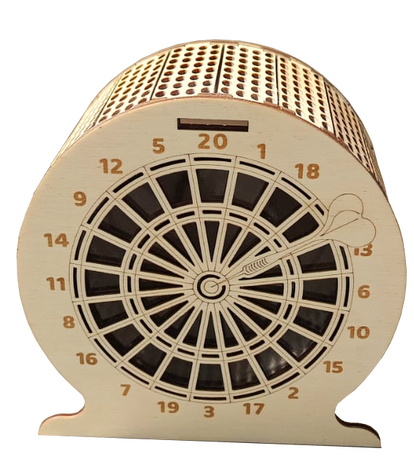 Entdecken Sie die einzigartige Dart-Spardose, gefertigt aus 4 mm starkem Pappelsperrholz mit präzisem Lasercut Verfahren. Diese runde Spardose besticht durch das detailreiche Design einer Dartscheibe, das einen faszinierenden Blick auf den Füllstand im Inneren duch die transparente Plexiglasscheibe ermöglicht.