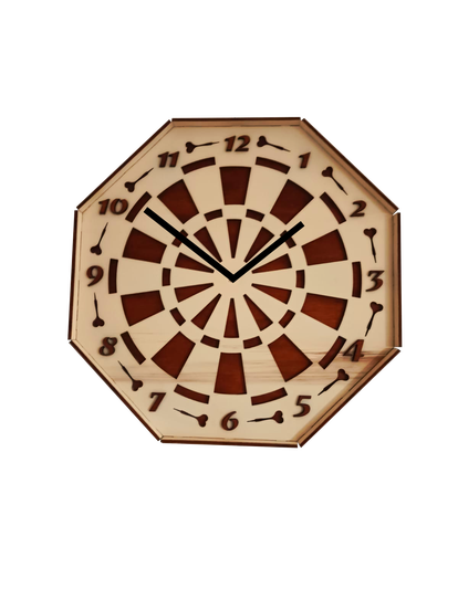 Das Innere der Uhr ist im Design einer klassischen Dartscheibe gehalten, während das Äußere in einer stilvollen achteckigen Form gestaltet ist. Dieses innovative Design sorgt nicht nur für eine stabile Struktur, sondern auch für ein ansprechendes visuelles Erlebnis aus jedem Blickwinkel.